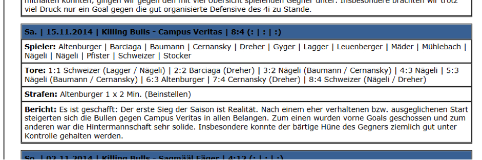 Mangels Detailstatistiken hier nur so viel: Endresultat: 4:11 Die Tore wurden allesamt vom ersten Sturm um Reto, Sami und Armin erzielt.